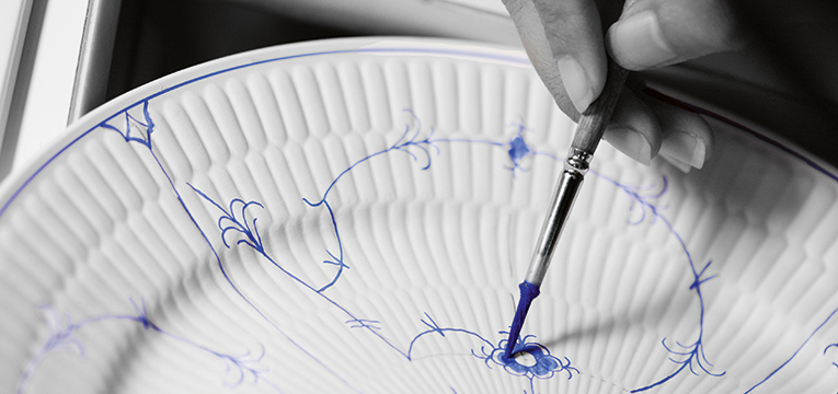 The original Danish name for Blue Fluted Plain is ‘Musselmalet’, ‘clam-painted’. While many believe the name refers to the fluted shape of the porcelain being reminiscent of a clam or seashell, the shape is in fact inspired by a stylized Crysanthemum and cinquefoil motif. Chrysanthemum flowers were a popular motif in China when Blue Fluted Plain came to life, and as the pattern developed, it kept its stylised chrysanthemum in a simple form, while a plant native to the Nordic region, the cinquefoil, grew next to it.